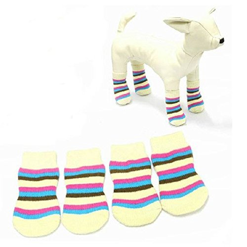 PRODUCT DESCRIPTIONS:Description: Cat Dog Socks Pet Colorful Stripe Pattern Cotton Socks Anti-slip Dog Socks â-Comfortable and warm for pet to wear, provide various of sizes. â-All socks are come with Non-slip sole to enchance grip. â-Prevent your pet dirt the floor, sofa, furniture and other home items. â-Reduce the risk of frostbite or slip during cold or rainy weather. Specification: Material: Cotton and spandex Color: Multicolor Size: S / M / L / XL SIZE TOE WIDTH LENGTH WIDTH FIT FOR DOG S 3.0cm(1.18") 6.0cm(2.36") 2.5cm(0.98") <1.5 kilos M 3.5cm(1.38") 7.5cm(2.96") 3.0cm(1.18") <3.5 kilos L 4.0cm(1.57") 9.0cm(3.54") 3.5cm(1.38") <7.5 kilos XL 4.5cm(1.77") 11cm(4.33") 4.0cm(1.57") <10 kilos Package Includes: 1 x Set Color Stripe Pet Socks(4 pcs)