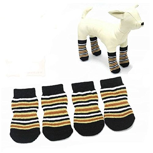 PRODUCT DESCRIPTIONS:Description: Cat Dog Socks Pet Horizontal Brown Stripe Cotton Knitted Anti-Slip Socks â-All socks are come with Non-slip sole to enchance grip. â-Prevent your pet dirt the floor, sofa,furniture and other homeâ€TM items. â-Reduce the risk of frostbite or slip during cold or rainy weather. â-Can insulation when the outdoor floor is hot in summer. ?Vivid and fashionable color make your pet more dynamic. Specification: Material: Cotton and spandex Color: Multicolor Size: S / M / L / XL Package Includes: 1 x Set Non-Slip Bubble Pet Socks(4 pcs)