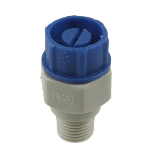 PRODUCT DESCRIPTIONS:- Gray and Blue plastic flat fan spray nozzle with a hemispherical shaped inlet and a "V" notched outlet. Features male thread, easy to install. Widely applied in surface treatment, electronics, environmental protection, car, steel, etc.