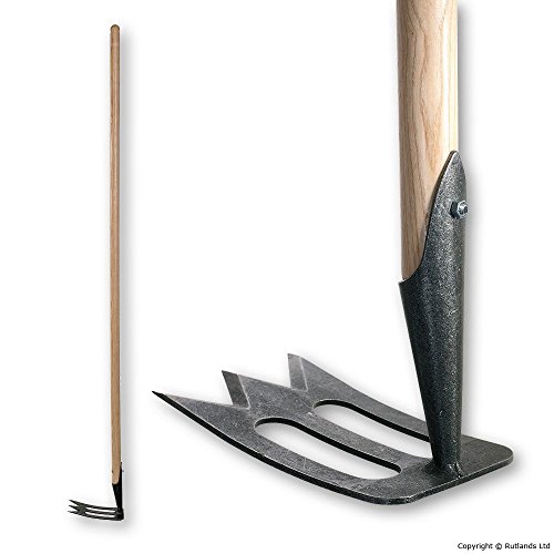 PRODUCT DESCRIPTIONS:• The most effective tool we offer for tilling and breaking up soil• Ergonomical non slip grip, oil finished for a lifetime of service• Forged from one piece of steel to ensure years of work• Hand forged in HollandThis is possible the most effective tool we have ever used for tilling and breaking up soil. The fully forged head features three sharp teeth that penetrate into the ground with ease and then when you pull the head toward you the sharp edges break up the clods. The open slots prevent the blade from clogging up with soil, making the Spork hoe lighter in use and the reduced friction allows it to slide effortlessly through the ground. Mounted on a 1400mm straight grain ash handle this hoe makes light work of preparing large areas of ground. Do not underestimate the design of this tool, it is simply superb. Hand forged in Holland. ©
