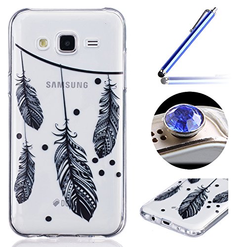 Etsue Clear Trsnaparent Soft Gel Case for Samsung Galaxy J5 2015,Pretty Feather Slim Soft Flexible Protective Case Cover for Samsung Galaxy J5 2015+Blue Stylus Pen+Bling Glitter Diamond Dust Plug Colors Random-Pretty Feather