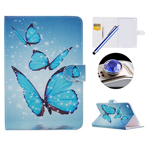 Etsue Leather Case with Stand for iPad Air/iPad 5,Elegant Blue Butterfly Book Style Pu Leather Wallet Flip Case with Card Holder for iPad Air/iPad 5+Blue Stylus Pen+Bling Glitter Diamond Dust Plug(Colors Random)-Blue Butterfly