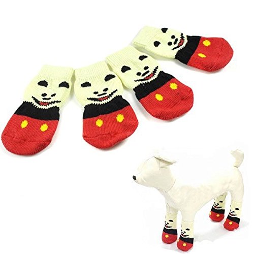 PRODUCT DESCRIPTIONS:Description: Panda Pattern Pet Dog Soft Cotton Anti-slip Knit Weave Warm Socks ?Good elastic, easy to take off or put on. â-Made from good quality cotton and spandex. â-Comfortable and warm for pet to wear, provide various of sizes. â-All socks are come with Non-slip sole to enhance grip. â-Reduce the risk of frostbite or slip during cold or rainy weather. Specification: Material: Cotton and spandex Color: Red Size: S / M / L / XL SIZE TOE WIDTH LENGTH WIDTH FIT FOR DOG S 3.0cm(1.18") 6.0cm(2.36") 2.5cm(0.98") <1.5 kilos M 3.5cm(1.38") 7.5cm(2.96") 3.0cm(1.18") <3.5 kilos L 4.0cm(1.57") 9.0cm(3.54") 3.5cm(1.38") <7.5 kilos XL 4.5cm(1.77") 11cm(4.33") 4.0cm(1.57") <10 kilos Package Includes: 1 x Set Non-Slip Bubble Pet Panda Pattern Socks(4Pcs)