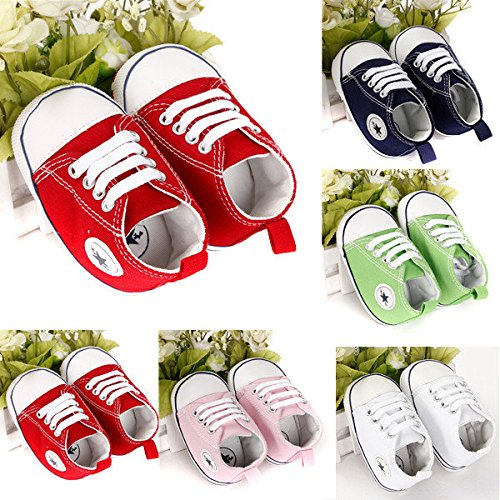 PRODUCT DESCRIPTIONS:Description : Baby Canvas Shoes Kids Soft Sneakers Boys Girls Infant toddler Moccasins Soft walker soles, easy to wear and not easy to fall off. Head wide design, more comfortable to baby wear, perfect for your baby learning walk. Suitable for spring, summer, autumn. Specification : Material : Canvas Fastening : slip on Color : Blue, Red ,Pink, Green, White Size Chart For Reference : Size Length Fit months 12 11cm/4.33inch 0-6 13 12cm/4.72inch 6-12 14 13cm/5.12inch 12-18 Package Includes : 1 x Baby Canvas Shoes Details Pictures :